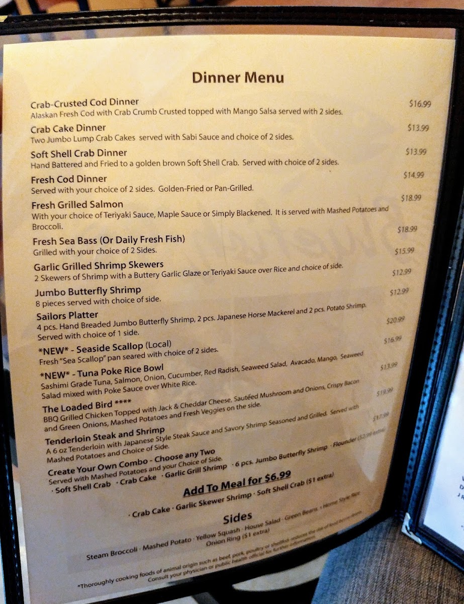 - Grill Selections: Feast on the CrabCrusted Cod Dinner or savor the flavors of the Fresh Grilled Salmon and Sailors Platter.